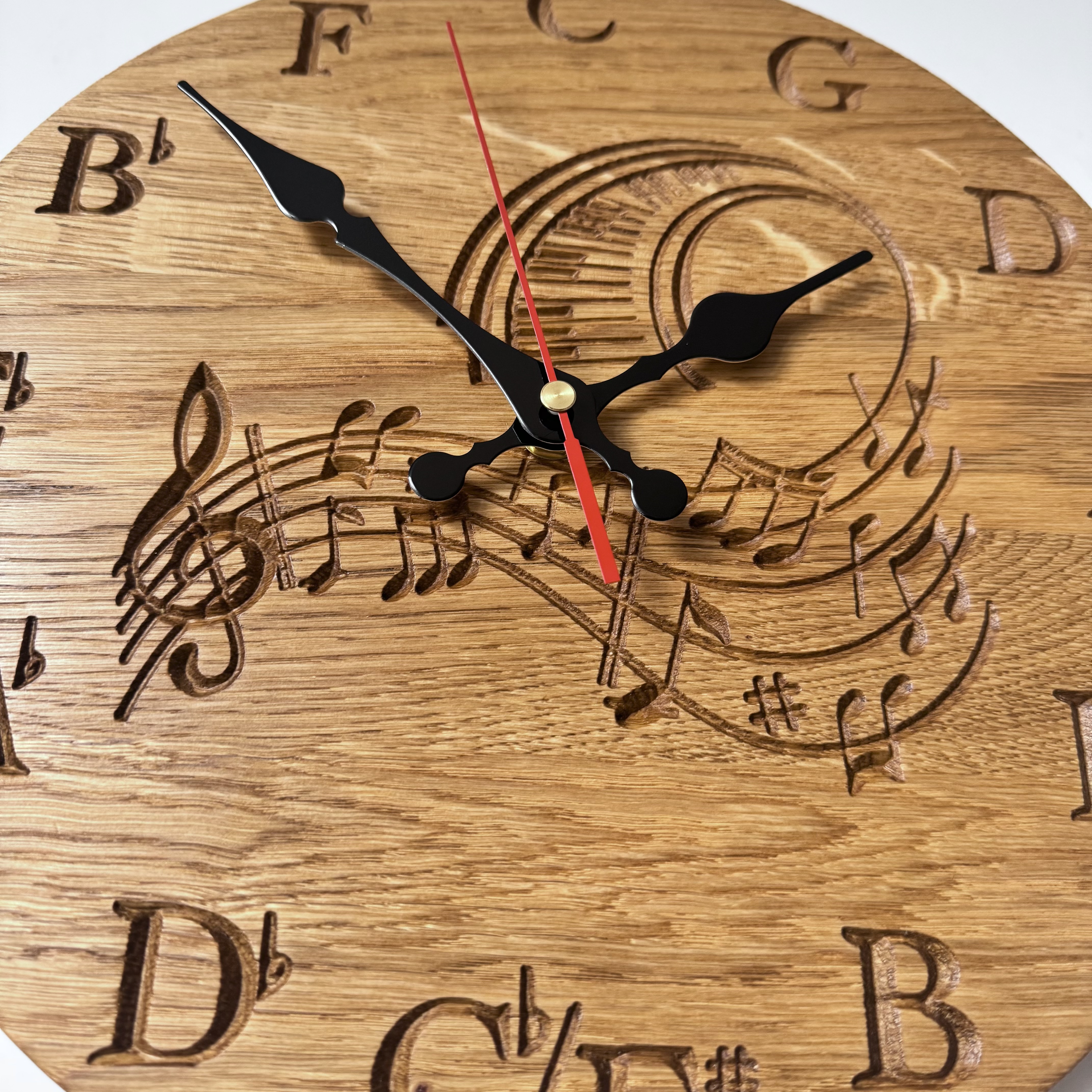 Na tarczy zegara precyzyjnie wyryto elementy muzyczne, które tworzą wyjątkową kompozycję. W centrum znajduje się pięciolinia z nutami oraz kluczem wiolinowym, symbolizująca harmonię i rytm. Wokół tarczy rozmieszczone są nazwy dźwięków gamy muzycznej (C, G, D, A, E, B, F oraz ich odmiany) zamiast tradycyjnych cyfr, dzięki czemu zegar staje się prawdziwą ozdobą dla każdego muzyka lub melomana.